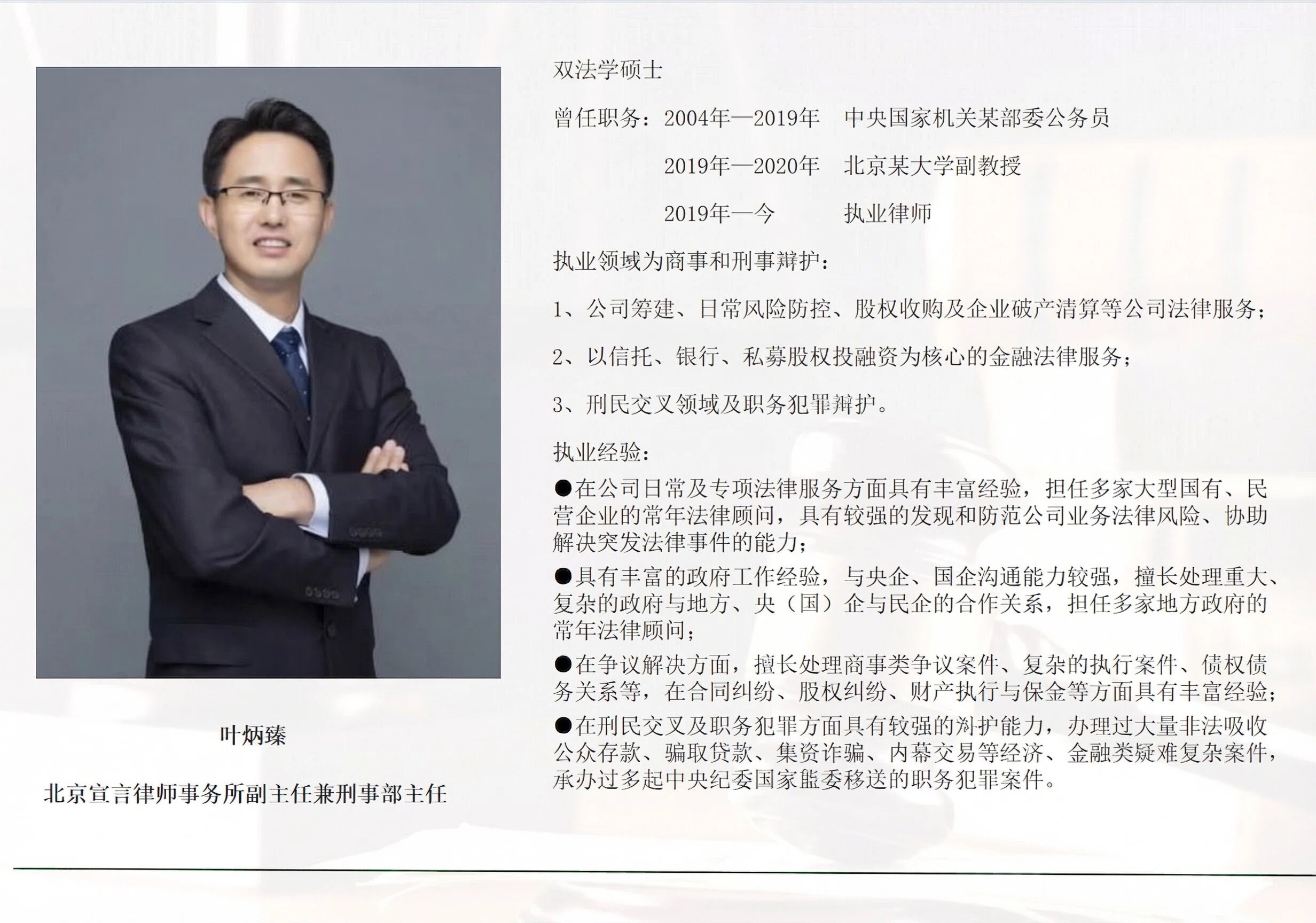 叶炳臻副主任深耕法律实务多年,专业功底扎实、办案经验丰富,长期专注公司法律风险防控、刑事合规与辩护、社会组织治理与公益法律服务,以专业、严谨、负责的执业态度获得司法行政机关、合作单位与社会各界高度认可,目前担任多家上市公司、国有大型企业、政府机关及社会公益组织的常年法律顾问,办理过众多商事争议、刑民交叉、职务犯罪案件。此次受聘中福协专家委员,既是对叶炳臻律师专业能力与行业影响力的权威认可,也是北京宣言律师事务所在社会福利、养老服务法治支撑领域综合实力的重要体现。